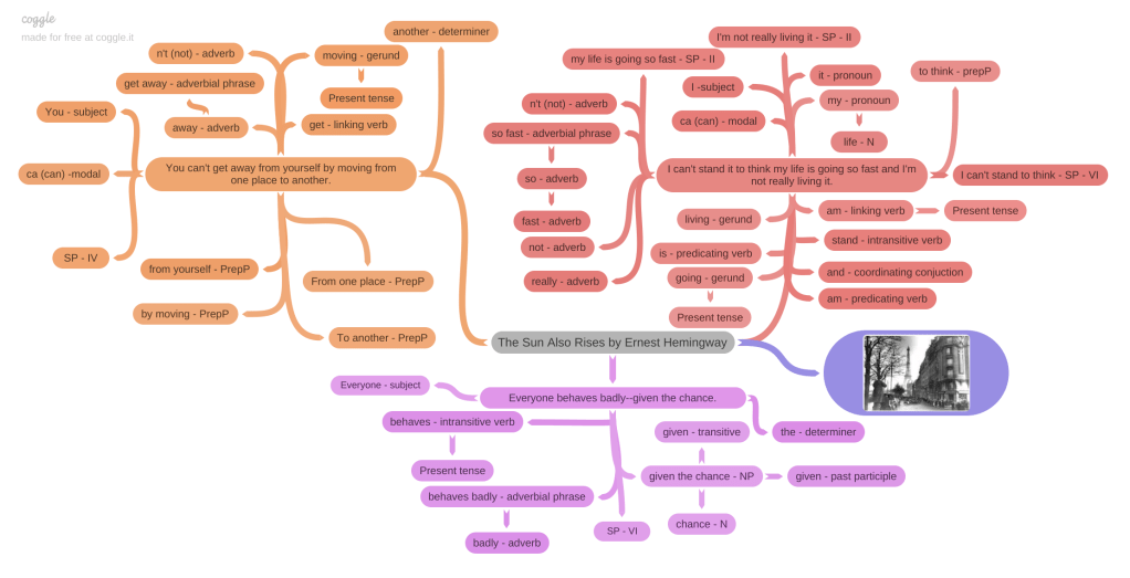 After conducting this research, I noticed several things. One can easily see that Fitzgerald’s writing has more diction than that of Hemingway’s. His writing is more poetic compared to Hemingway’s precise writing style. I noticed this because the three sentences that I selected from The Great Gatsby had more prepositional phrases than that of The Sun Also Rises. He wants us to not forget nouns nor the object of prepositions in his writing. The reason behind it is because of F. Scott Fitzgerald’s sentences in the novel tend to be complex sentences and compound-complex sentences, while Ernest Hemingway’s sentences are more simple. Even though his writing style is longer, I am trying to understand why Fitzgerald does this, and it is because he wants to provide as many details as possible. I think it is because he wants the reader to get to know the narrator, Nick Carraway, more. Which is most likely why there are more determiners in the sentences than Hemingway’s.